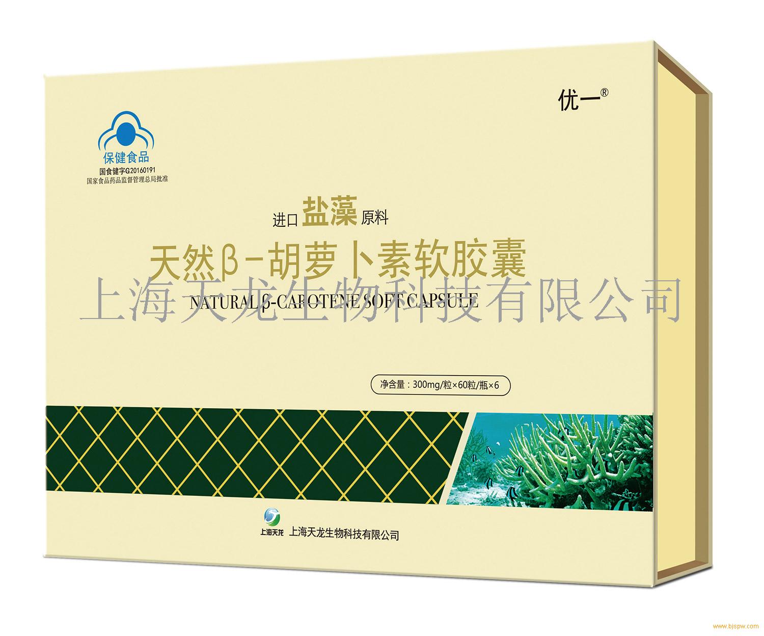 | 优一®天然β-胡萝卜素软胶囊 每粒含β-胡萝卜素1.26mg 本品是以天然β-胡萝卜素(天然β-胡萝卜素、大豆油)、维生素E(DL-α-生育酚醋酸酯)、葵花籽油、蜂蜡、明胶、甘油、纯化水为主要原料制成的保健食品,具有β-胡萝卜素的保健功能。 批准文号】国食健字G20160421主要... |