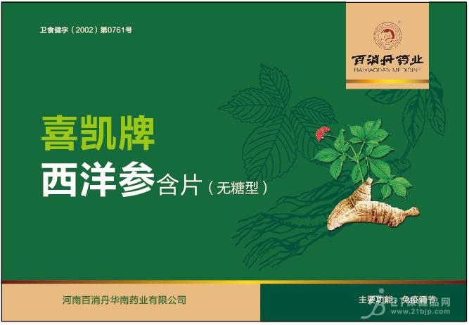 | 喜凯牌西洋参含片(无糖型)卫食健字(2002)第0761号免疫调节产品名称 喜凯牌西洋参含片(无糖型) 批准文号 卫食健字(2002)第0761号 保健功能 免疫调节 功效成分/标志性成分含量 每100g含:总皂甙(以人参皂甙Re计)949mg 主... |